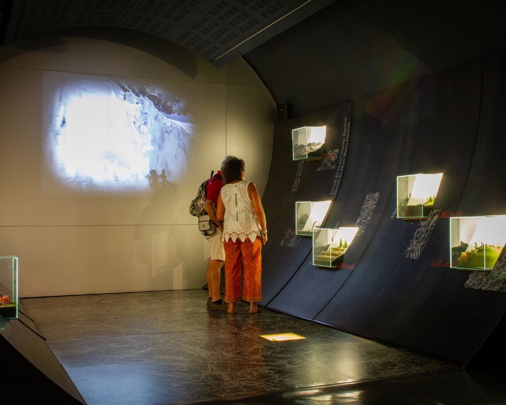 The exhibition space consists of twenty-nine rooms divided into four parts. Immediately involving the visitor, the discovery of the Alps begins with short video projections outlining the themes covered in each of the four sections and narrated by four specialists: a naturalist, a geographer, an anthropologist and a meteorologist. In the first of the four sections the visitor is presented with an interpretation of contemporary landscape.